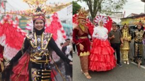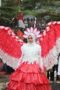 memakai baju karnaval dengan konsep Burung Garuda ketika diamati lebih dekat, kostum burung garuda itu terbagi menjadi empat bagian, yakni topi yang berbentuk menyerupai burung, tameng baju, sayap dan rok gaun.