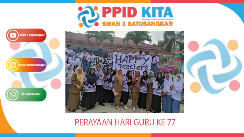 SMK Negeri 1 Batusangkar_Senin, 28 November 2022 Seluruh guru , pegawai dan siswa SMK Negeri 1 Batusangkar ikut memeriahkan peringatan Hari Guru Nasional ke 77 yang jatuh pada tanggal 25 November 2022 pada hari jum’at. kegiatan yang dilaksanakan sangat meriah dan dinikmati oleh seluruh warga sekolah.