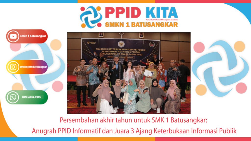 SMK Negeri 1 Batusangkar_ 12/12/2022. Tanggal cantik yang memberikan catatan indah untuk SMK Negeri 1 Batusangkar melalui lembaga keterbukaan informasi PPID KITA. Melalui ajang keterbukaan informasi yang di selenggarakan oleh Komisi Informasi Provinsi Sumatera Barat, PPID KITA SMKN 1 Batusangkar telah berhasil menggoreskan tinta prestasi dengan meraih Predikat sebagai PPID Informatif serta Juara 3 ajang keterbukaan informasi tingkat SMA/SMK/MA se Provinsi Sumatera Barat.
