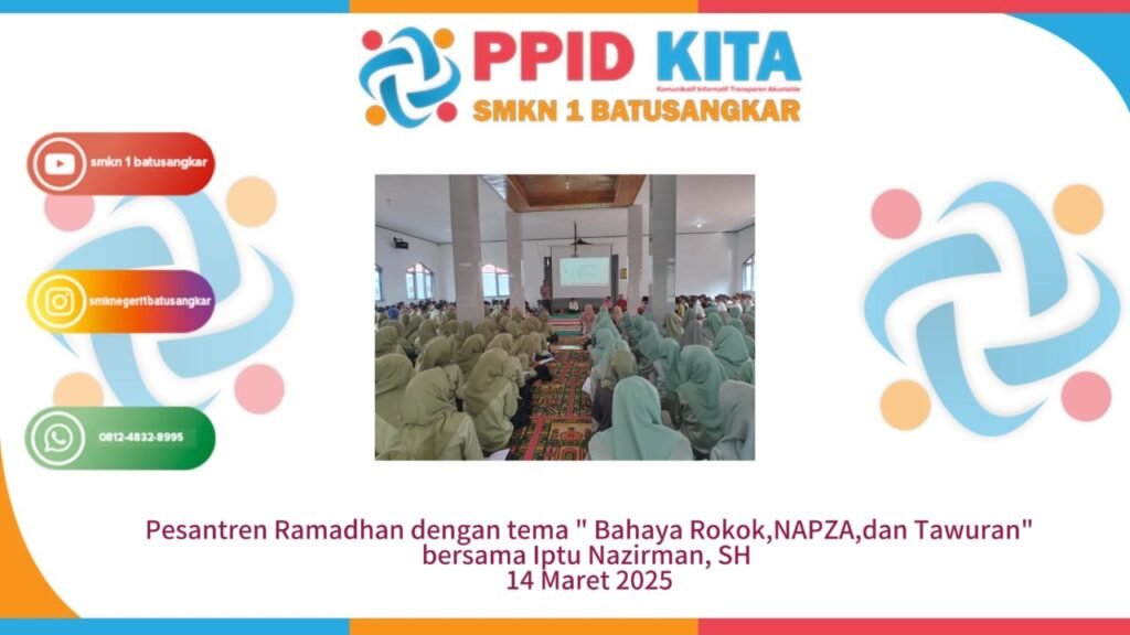 Pada tanggal 14 Maret 2025 siswa SMKN 1 Batusangkar mengikuti kegiatan pesantren Ramadhan dengan tema ” Bahaya Rokok, Napza, dan Tawuran bersama Iptu Nazirman, SH