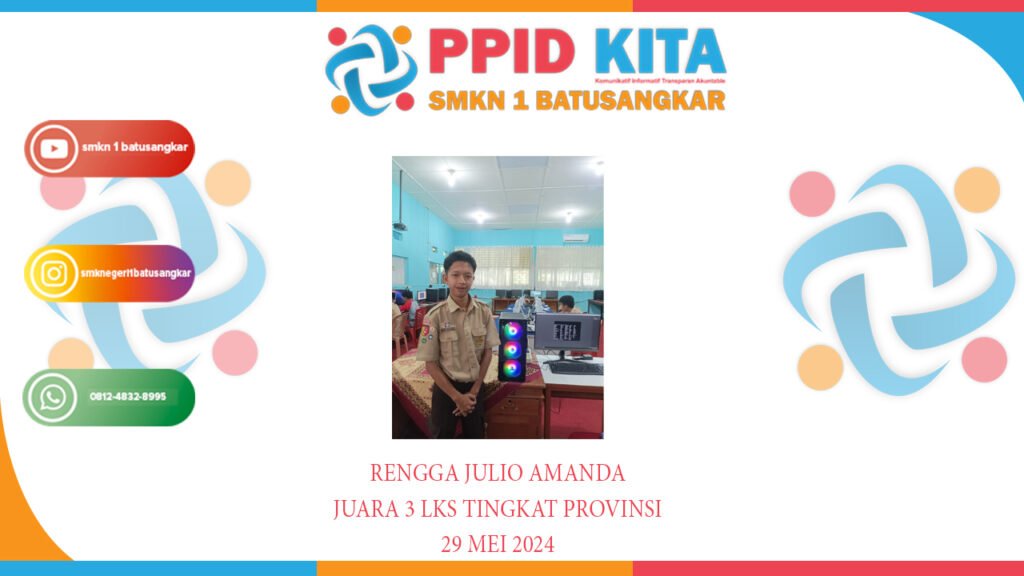 Pada tanggal 26-28 Mei 2024 bertempat di SMKN 2 yaitu Lomba LKS tingkat Provinsi yang diikuti oleh siswa SMKN 1 Batusangkar yang bernama Rengga Julio Amanda adalah siswa kelas 11 jurusan Teknik Komputer dan Jaringan dan alhamdulillah memenangkan perlombaan dengan meraih juara 3 denganĀ bidang perlombaan IT Network Administrasi Tingkat Provinsi Sumbar