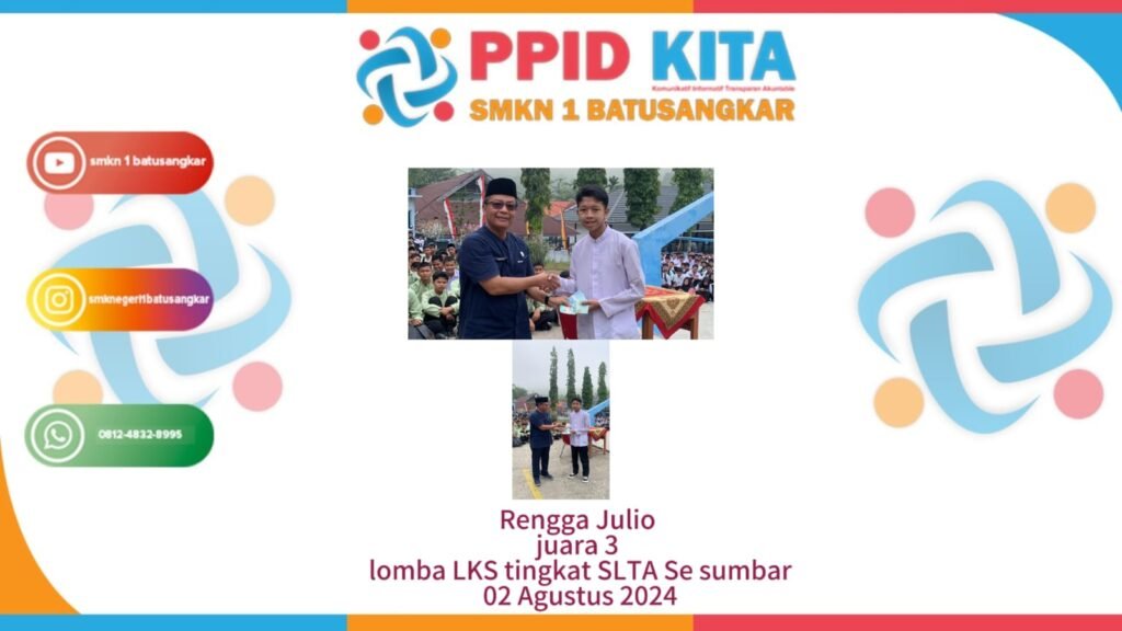 Pada tanggal 02 Agustus 2024 Rengga Julio Siswa jurusan Teknik Komputer dan Jaringan mengikuti lomba LKS IT NETWORK ADMINISTRATION di SMKN 6 Padang dan meraih juara 3 dibidang lomba tersebut
