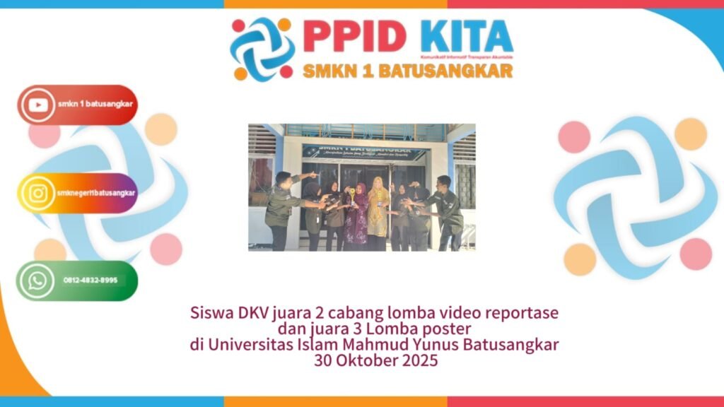 Dengan penuh rasa syukur dan bangga, kami mengabarkan bahwa salah satu tim terbaik dari SMKN 1 Batusangkar kami berhasil meraih Juara dalam Lomba Video Reportase tingkat sekolah Kemenangan ini menjadi bukti bahwa kreativitas, kerja keras, serta kemampuan komunikasi siswa mampu menghasilkan karya yang inspiratif dan berkualitas.